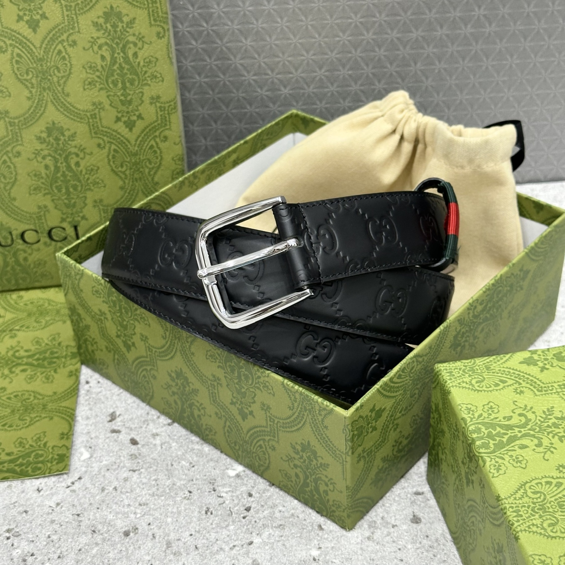 GU black belt with embossed letters and round shiny silver GG face C Super Class